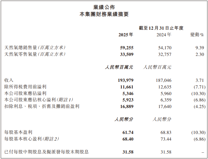 3月24日,昆仑动力(00135.HK)发布规章2025年12月31日止年度财务节录。数据露出,公司全年收入为东谈主民币1939.79亿元,同比增长3.71%。所得税前溢利东谈主民币116.61亿元,同比减少7.71%;推动应占溢利东谈主民币53.46亿元,同比减少10.30%,每股基本盈利东谈主民币61.74分,同比下落10.30%。公司合手续开展耗损企业惩处,2025年进行了金钱减值。剔除该等一次性身分,推动应占中枢溢利东谈主民币59.23亿元,同比减少6.86%,每股基本中枢盈利东谈主民