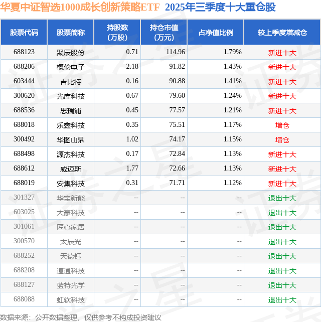 从基金限度来看,中原中证智选1000成长立异策略ETF基金2025年三季度公布的基金限度为0.64亿元,较上一期限度4369.88万元变化了2058.13万元,环比变化了47.1%。该基金最新一期钞票竖立为:股票占净值比99.81%,无债券类钞票,现款占净值比0.37%。从基金捏仓来看,该基金当季前十大股票仓位达12.78%,第一大重仓股为聚辰股份(688123),捏仓占比为1.79%。